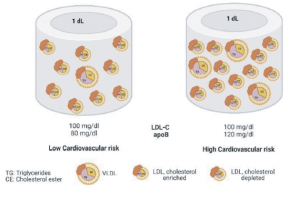 O fato de que cada partícula aterogênica circulante possui uma molécula de apoB oferece uma informação valiosa para o clínico. É possível estimar o tamanho das lipoproteínas que tem o potencial de criar placas de colesterol nas paredes arteriais. Quanto menores essas partículas, maior o potencial aterogênico. A figura abaixo ilustra dois pacientes hipotéticos, em que a mesma concentração de colesterol circulante (100 mg/dl) pode ser mais aterogênica se estiver contida em um número maior de partículas, consequentemente com mais apoB (paciente da direita).